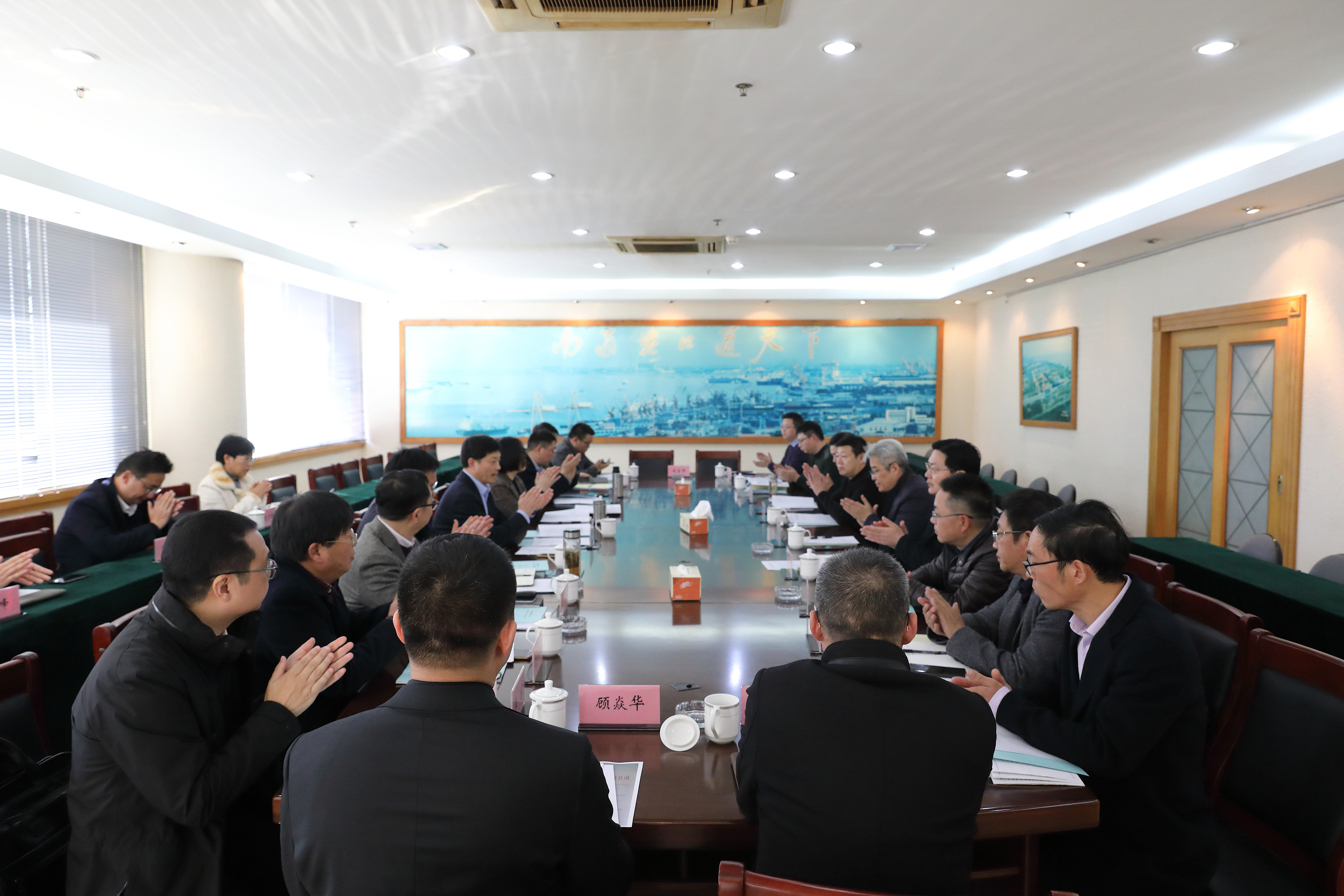 南通港集團有限公司第一屆董事會第八次會議暨2019年第一次臨時股東會于2019年12月6日下午在港口大廈一樓會議室召開,集團黨委書記、董事長施渠平主持會議,集團黨委副書記、總經理、副董事長朱玉強和股東代表、集團董事出席會議,集團黨委副書記、工會主席陳云,紀委書記崔劍,副總經理過興發及集團法律顧問列席會議。